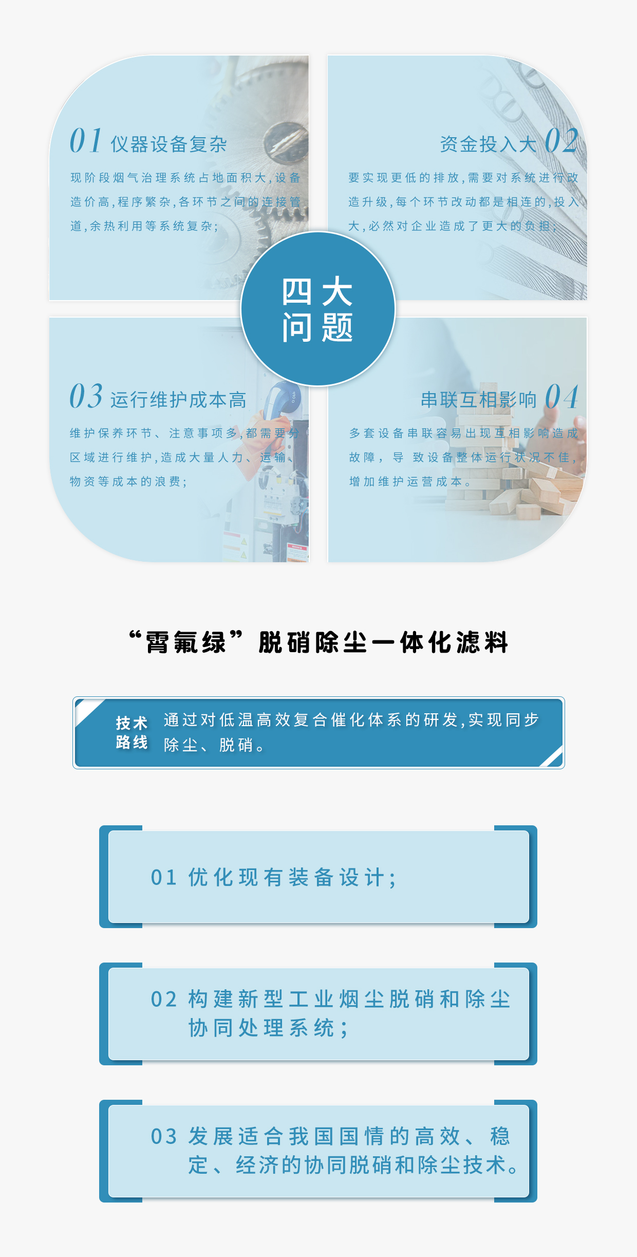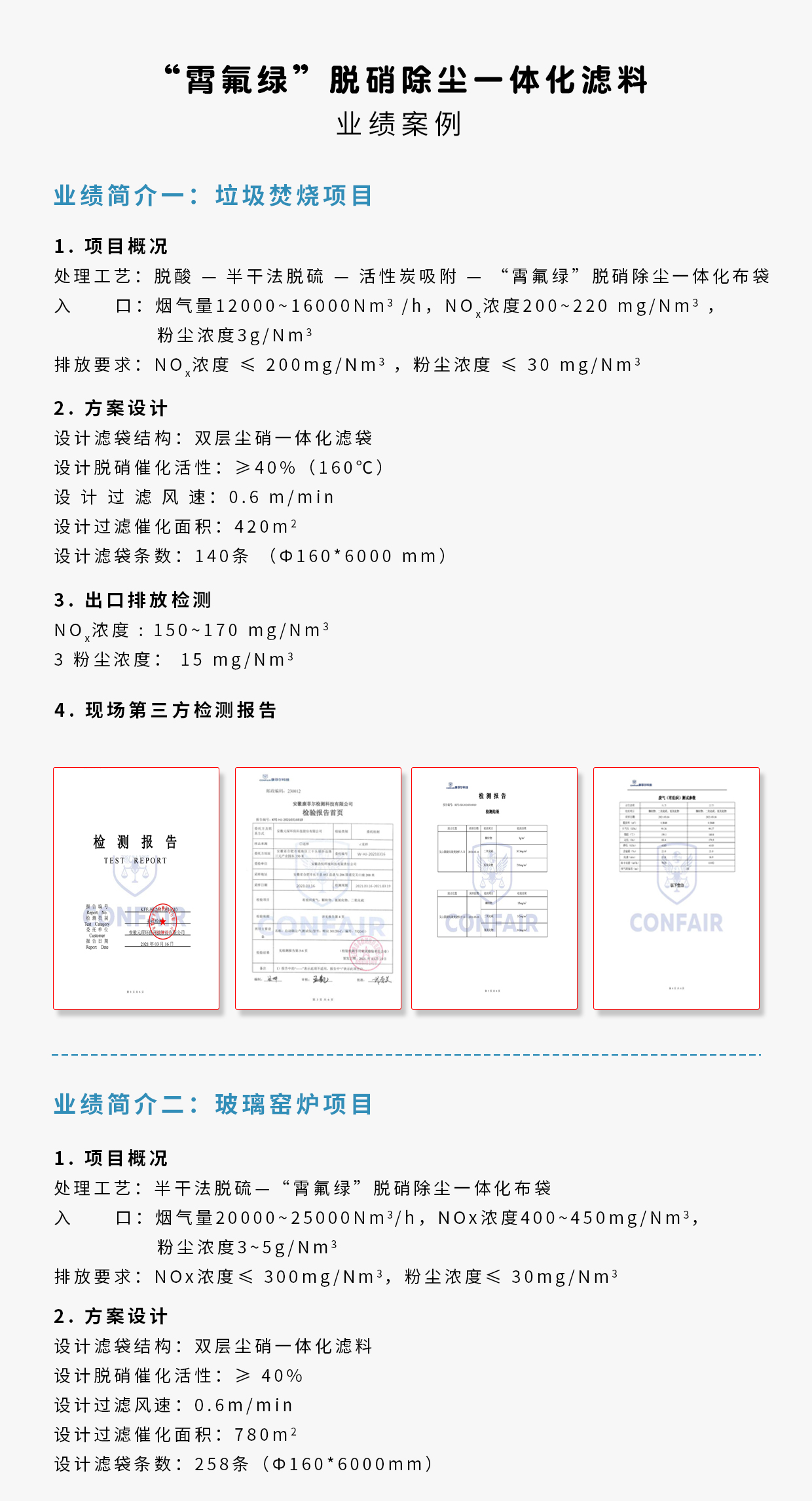 | 应用场合 | 硫含量低、水含量低、过滤精度 较低的场合代替布袋与部分SCR脱硝催化剂 |